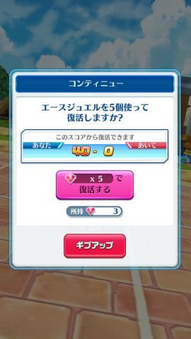 ツアーでCPUに負けた場合に「エースジュエル」3個でコンティニューをすることができます。
