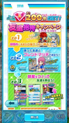 「友達招待キャンペーン」の期間内に新しく友達に「白猫テニス」を初めてもらい、1日以内にその友達とフレンドマッチをして初めての相互フォローとなると、一人につき20個、最大10人で200個の「エースジュエル」をもらえるというものです。