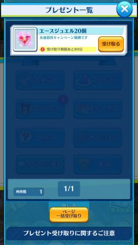 3つの条件をクリアすると「プレゼント」に「エースジュエル」が20個届きます。