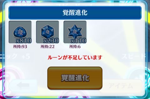 覚醒進化させたいキャラクターのソウルボード中央に大きな宝石のようなものがあるので、それをタップすると、覚醒進化に必要なルーンが表示されます。
