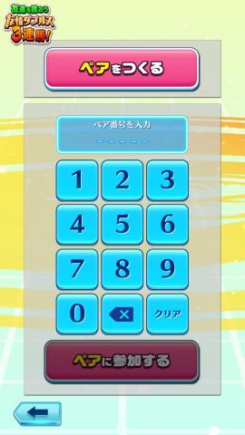 今回の「友情ダブルス」はチームでプレイするダブルスとは違い、パートナーに「ペア番号」を入力してもらい、ペアを作ってプレイします。