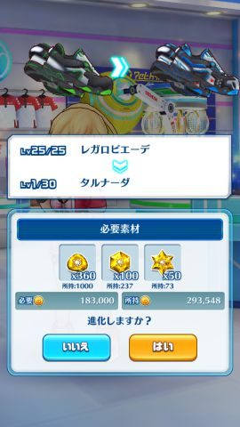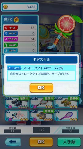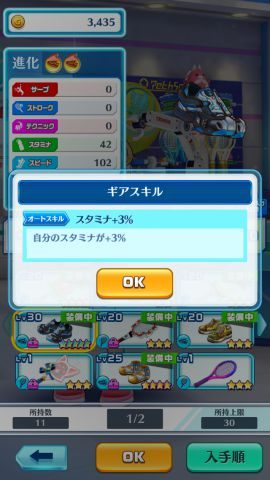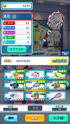 「ギア」(ラケット・シューズ)は最大星5までの進化が可能となっており、進化することでパラメータが上昇するので、主力キャラクターの装備するギアはぜひとも進化させておきたいところです。