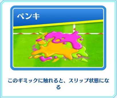 「ペンキ」を踏むと「スリップ」状態になり、滑っている間は行動不能になります。