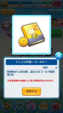 ▲「テニス入門書~ゴールド~」を使うことで30分間ゴールドの入手量を2倍にできる。