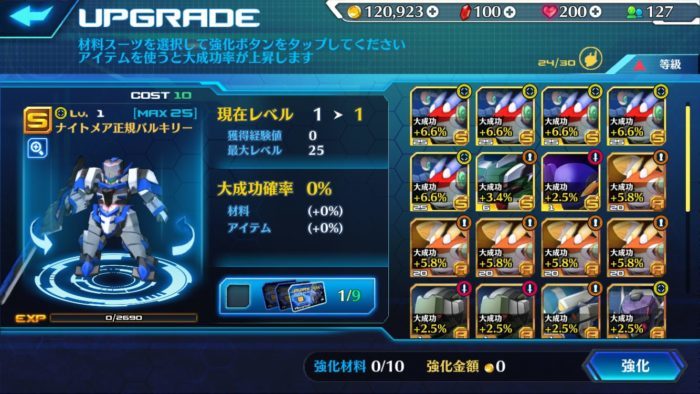 素材の種類と量を調整し、アスガルドチケットを組み合わせて大成功率を100%以上にして強化を行うと効率的にレベルを上げることができます。