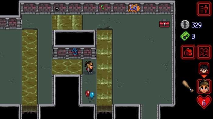 右に移動し、風船を割った後、上の水に流されて右下の部屋に進む。