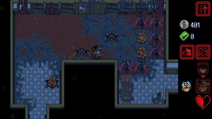 2つの装置を殴ると広い部屋の監視カメラが止まり、下の扉が開く。