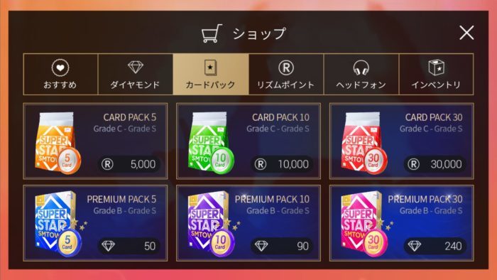 カードパックはショップからリズムポイントかダイヤを使って購入することができます。