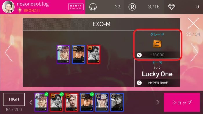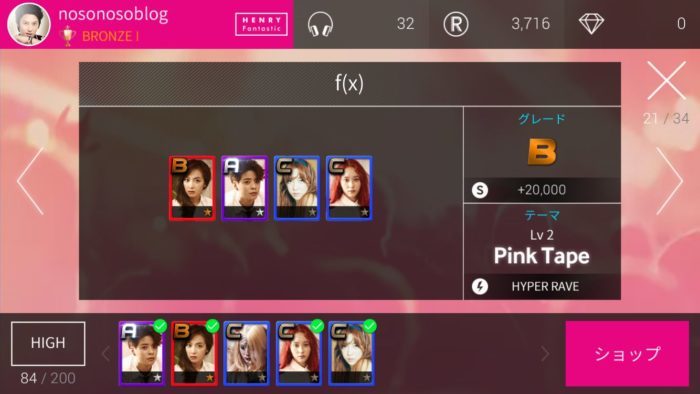 参考までに、ほとんどSUPER PERFCTでクリアした場合にBグレードのカードはCグレードのカードの約4倍のスコア、AグレードのカードはBグレードのカードの約1.5倍のスコアとなりました。