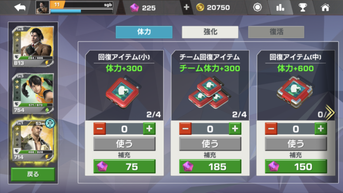 キャラクターの体力がバトル後に引き継がれ、KO状態になると一定時間バトルに参加できなくなるため、体力は他のゲームでいうところのスタミナの役割を担っています。