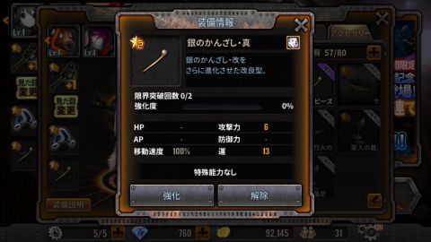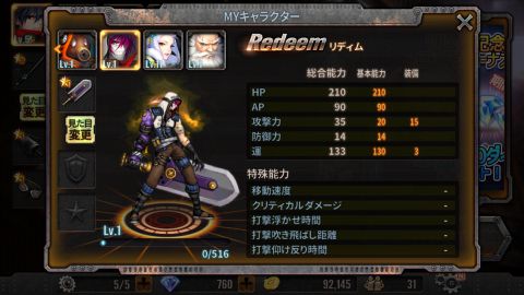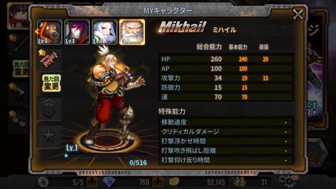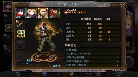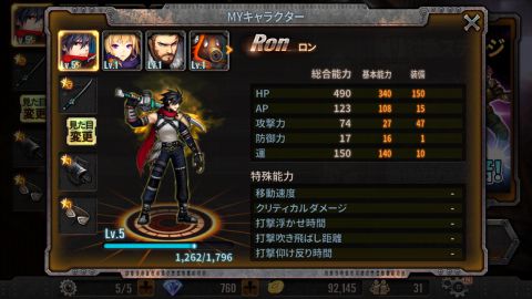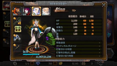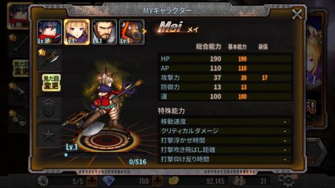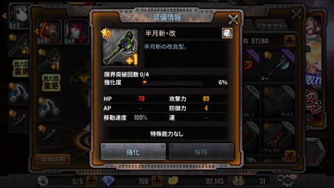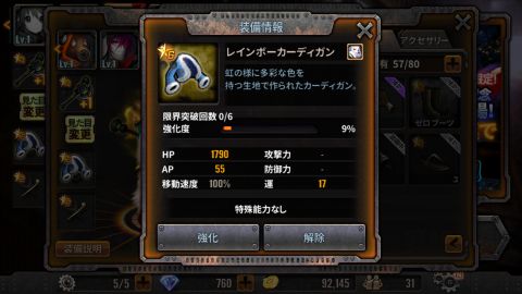 各キャラは武器、防具、アクセサリを装備することでパラメータを強化することができます。