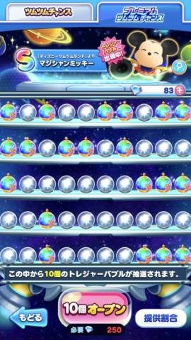 プレミアムツムツムチャンスはダイア250個でレインボーバブル20個、ノーマルバブル30個から10個のバブルをオープンします。