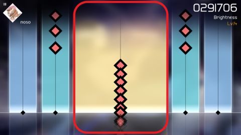 逆に速すぎてノーツが認識できない場合は、遅くすることでノーツの縦の間隔が縮まって先のノーツが見えやすくなります。