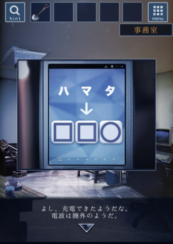 - 左の机でスマホを充電すると「ハマタ」と「□□〇」の文字が現れる。