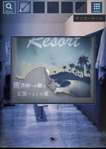 - 左の壁の破れたポスターから「書庫への鍵は玄関マットの裏にある」ことを確認する。